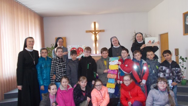 Žiaci zo Základnej školy sv. Vincenta v Ružomberku dostali v Roku zasväteného života milú úlohu - každý mesiac sa modliť za niektoré rehoľné spoločenstvo. Minulý mesiac sa modlili za Kongregáciu Milosrdných sestier Svätého kríža. Sestry  tejto kongregácie žijú a pracujú aj v Ružomberku. Žiaci sa preto rozhodli, že ich navštívia. Priniesli im duchovnú kyticu zloženú z modlitieb za sestry. Druháci vyhotovili aj srdce, do ktorého lepili kvety. Každý kvet na plagáte predstavuje jednu modlitbu Zdravas. Okrem duchovnej kytice sestrám odovzdali aj život bl. Zdenky Schelingovej v obrazoch.