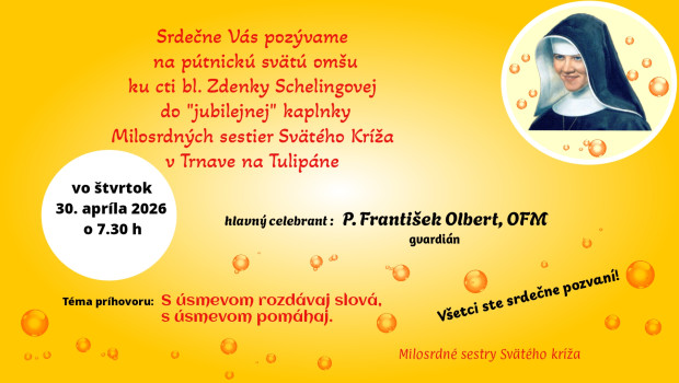 Pozvanie do Trnavy k bl. ZdenkeKategória: Top správyV posledný aprílový deň Vás srdečne pozývame k bl. Zdenke do TrnavyBlahoslavená Zdenka, oroduj za nás! 15. 04. 2026
